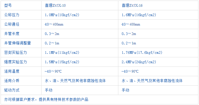 平底式閥座 ——傳統(tǒng)的閘閥往往在通水洗管后即因外物諸如石頭、木塊、水泥、紙屑、雜物等淤積于閥底凹槽內(nèi),容易造成無法關(guān)閉緊密而形成漏水現(xiàn)象,軟密封閘閥底部采用與水管相同的平底設(shè)計,不易造成雜物淤積,使流體通暢無阻。整體包膠—— 閥門采用的橡膠進(jìn)行整體內(nèi)、外包膠,國內(nèi) 的橡膠硫化技術(shù)使得硫化后的閥門能夠保證 的幾何尺寸,且橡膠與球墨鑄鐵閥門接著牢靠,不易脫落及彈性記憶佳。耐腐蝕—— 閥體采用粉體環(huán)氧樹脂涂裝,可防止閥體的腐蝕及生銹,并可用于污水系統(tǒng)。不易碎裂 以往傳統(tǒng)鑄鐵閘閥常因外物擊中、碰撞或重疊而造成斷裂等現(xiàn)象。由于本體改用球墨鑄鐵,此種情形已可大副度減少。三“O”型環(huán)密封圈—— 由于閥桿采用三“O”型環(huán)密封圈密封設(shè)計 ,可減少開關(guān)時的摩擦阻力,大幅減少漏水現(xiàn)象及可以不停水施工更換密封圈。有助生飲—— 由于閥體內(nèi)部以無毒性環(huán)氧樹脂涂裝,閘板的內(nèi)外表面均以橡膠完全包覆而不Z于出現(xiàn)銹水或腐蝕現(xiàn)象,可供生飲。精鑄閥體 ——閥體采用精密鑄造, 的幾何尺寸使得閥體內(nèi)部無需任何精加工即可保證閥門的密封性。重量輕 ——本體采用球墨鑄造制成,重量較傳統(tǒng)閘閥重量減輕約20%~30%,安裝維修方便。 MZ45X-10、MZ45X-16Q直埋式彈性座封閘閥技術(shù)參數(shù):