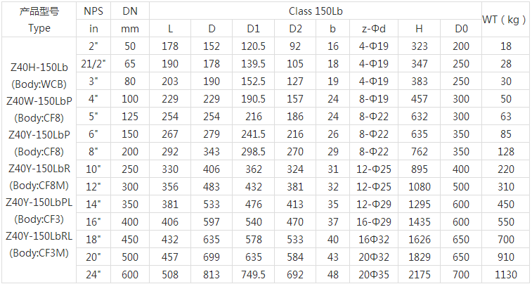 不銹鋼美標閘閥Z41W-150LB尺寸列DimensionList 單位 Unit: mm