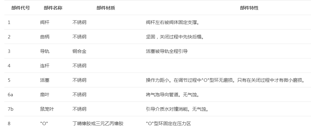 5、選材精良:閥門的關(guān)鍵部位如閥座、擋塊、導軌等部件均采用特殊的不鋼筋材料制作,此材料耐磨、耐氣蝕,硬度為普通不鋼筋的三倍。