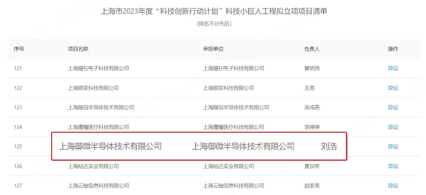 近日,上海市科學技術(shù)委員會正式發(fā)布《關(guān)于公布2023年度上海市科技小巨人工程立項名單的通知》,御微半導體經(jīng)公開自主申報、浦東新區(qū)審核推薦、專家評審和公示,正式被市科委、市經(jīng)信委和市財政局審定為2023年度上海市科技小巨人企業(yè),榮獲2023年度上海市“科技小巨人”工程立項。